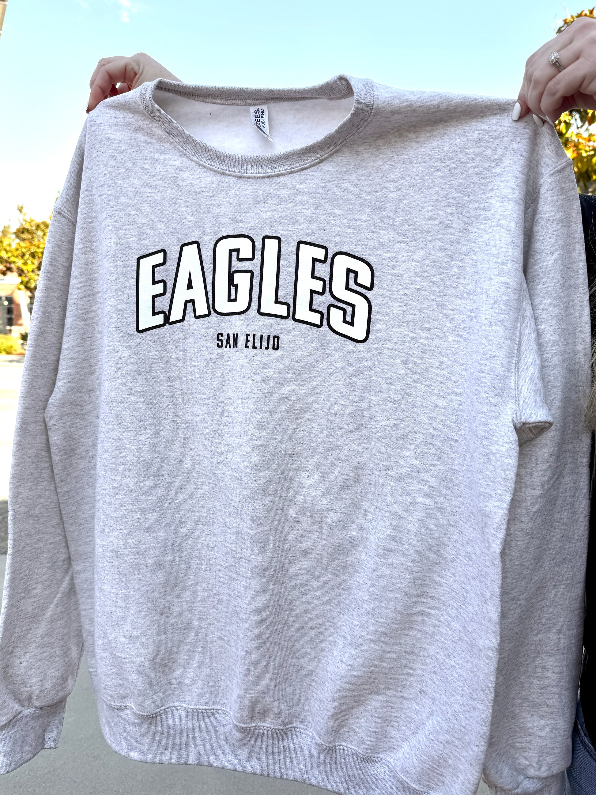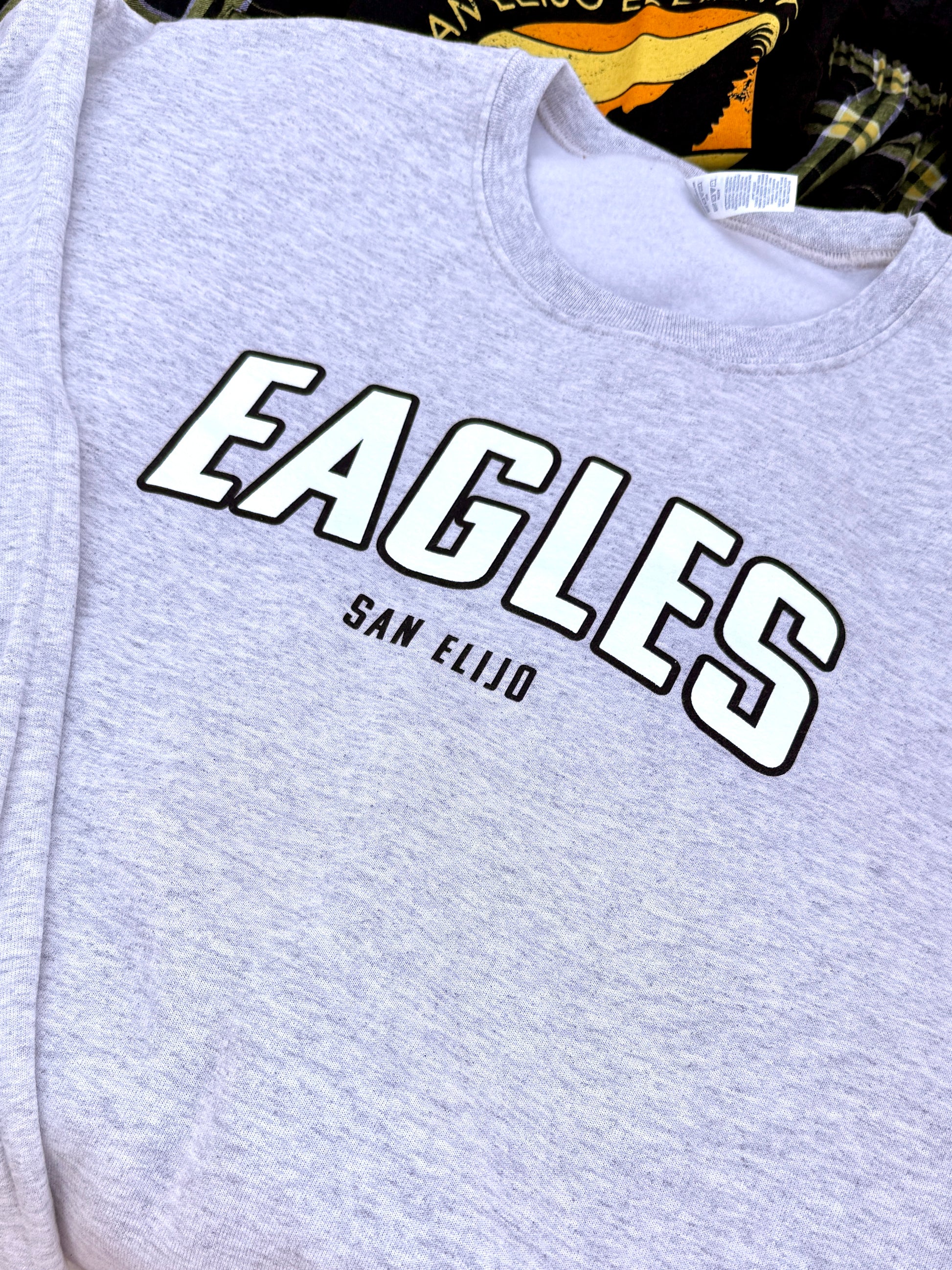 Designed for comfort and school spirit, this cozy fleece sweatshirt features bold “EAGLES” lettering outlined for impact, with “SAN ELIJO” subtly printed below. Perfect for parents, staff, and fans looking to support the Eagles at Flag Salute, field trips, and SEES events.