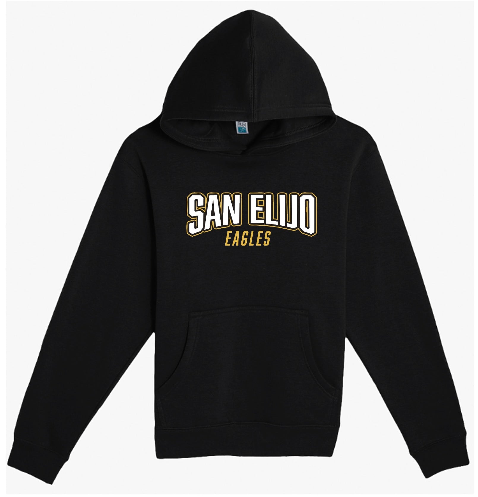 Classic black hoodie with bold San Elijo Eagles print in white and gold