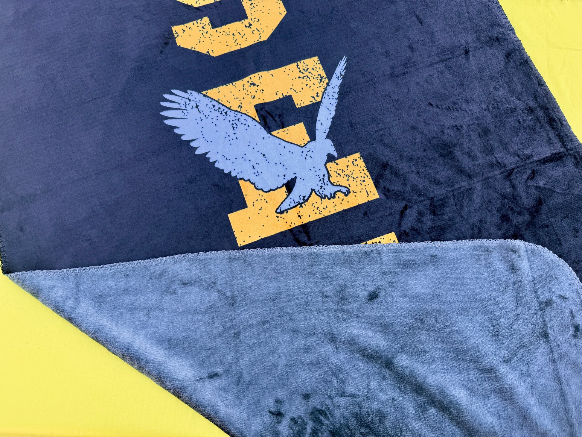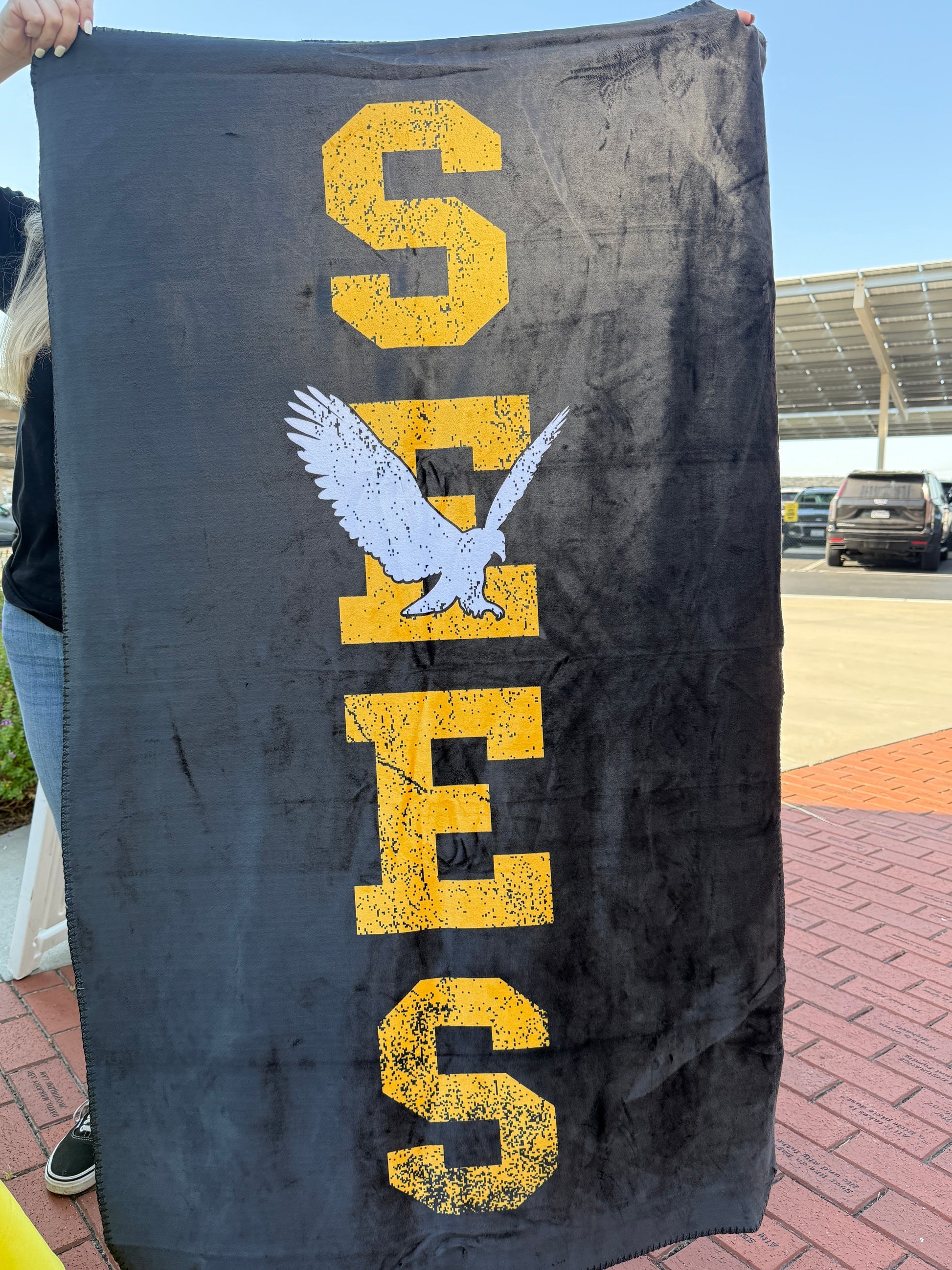 Wrap yourself in comfort and school pride with this Spirit Blanket! Featuring bold gold lettering and a soaring eagle across a sleek black backdrop, this blanket is the perfect combo of cozy and cool.